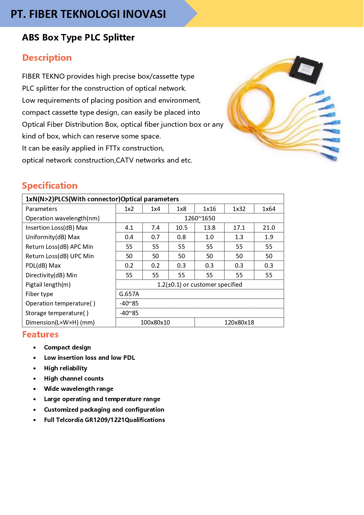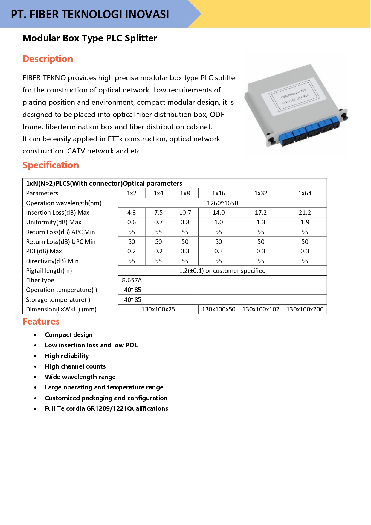 FIBER TEKNO provides high precise modular box type PLC splitter for the construction of optical network. Low requirements of placing position and environment, compact modular design, it is designed to be placed into optical fiber distribution box, ODF frame, fibertermination box and fiber distribution cabinet.