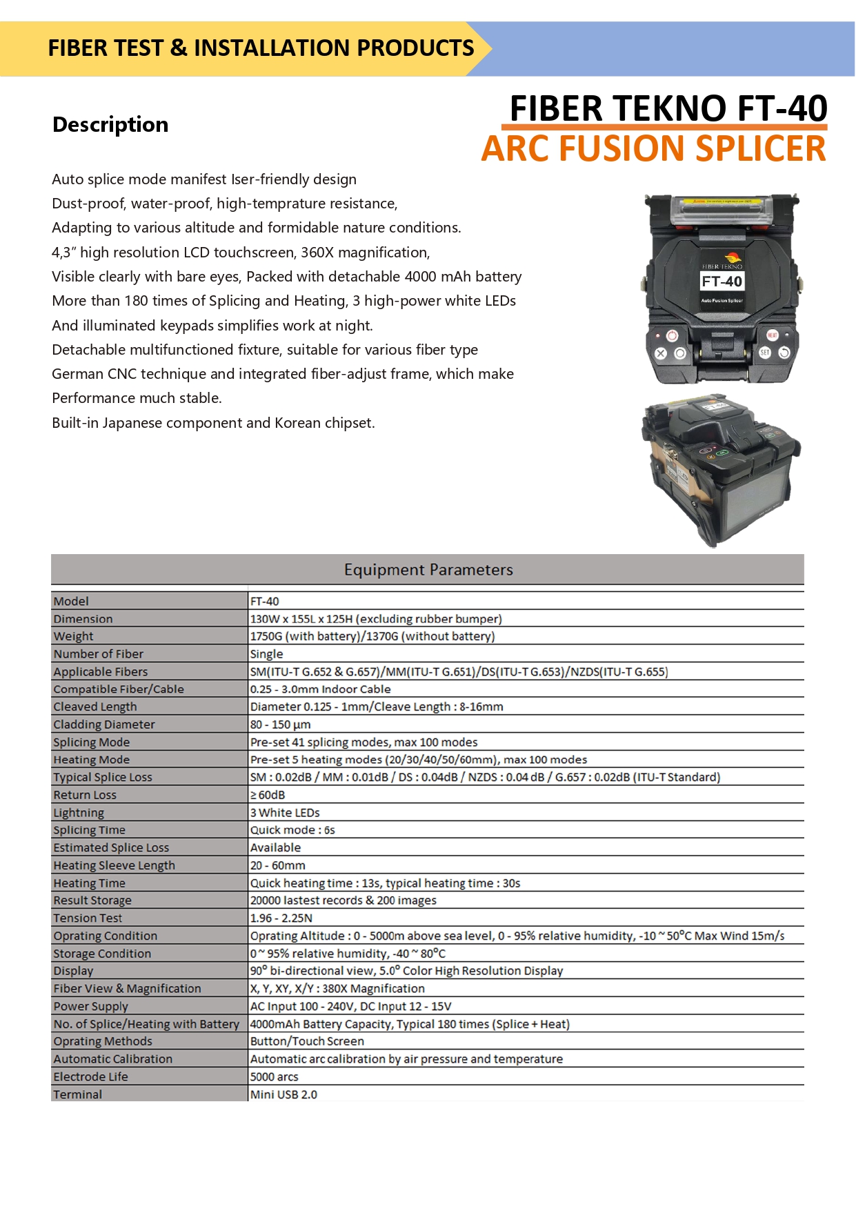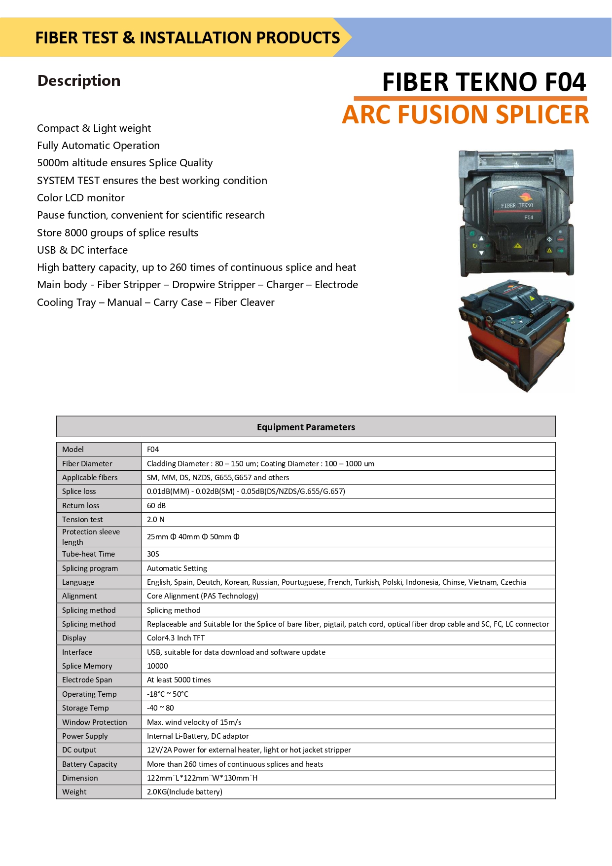 Auto splice mode manifest Iser-friendly design. Dust-proof, water-proof, high-temprature resistance, Adapting to various altitude and formidable nature conditions. 4,3” high resolution LCD touchscreen, 360X magnification,