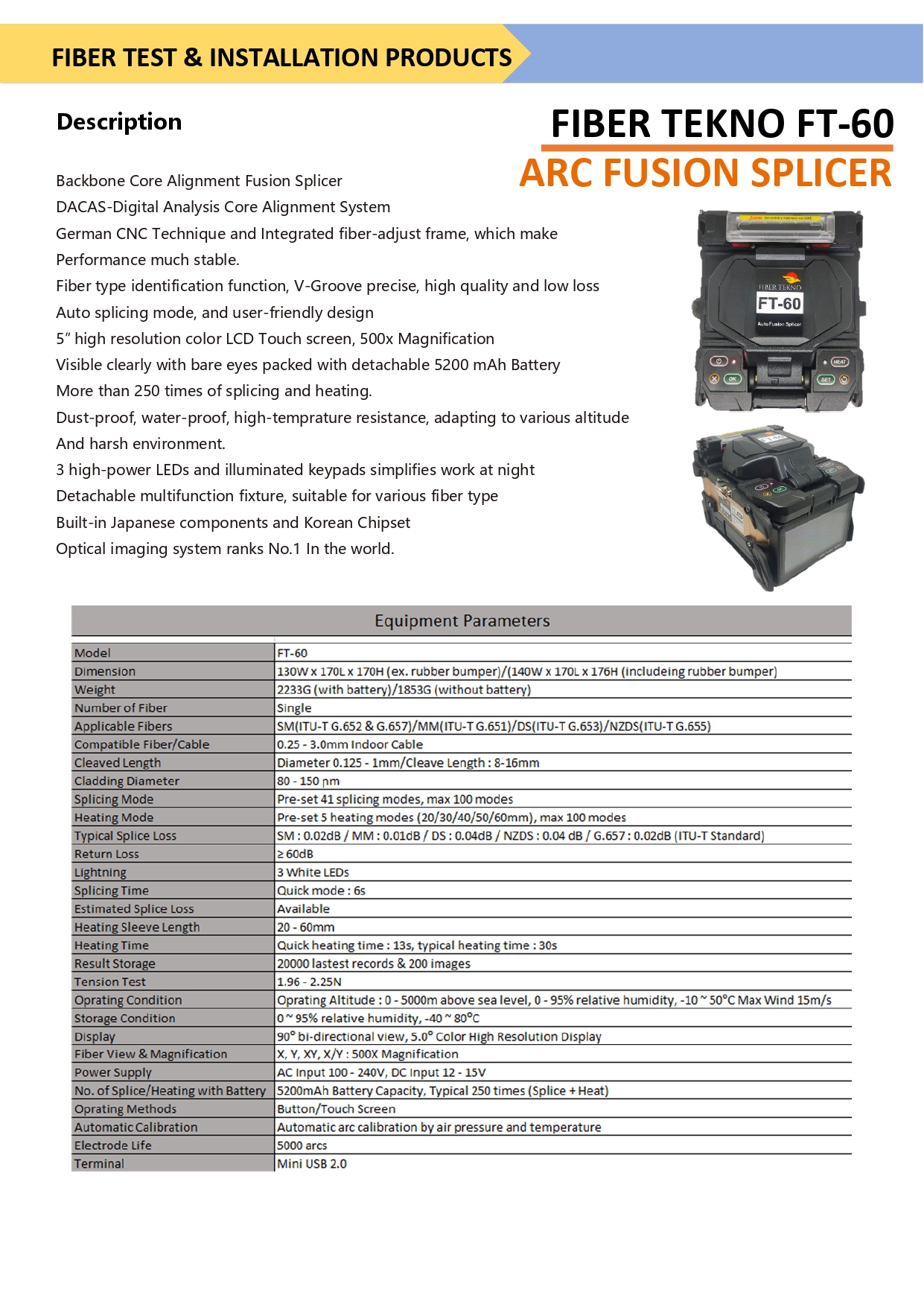 USB & DC interface, High battery capacity, up to 260 times of continuous splice and heat .