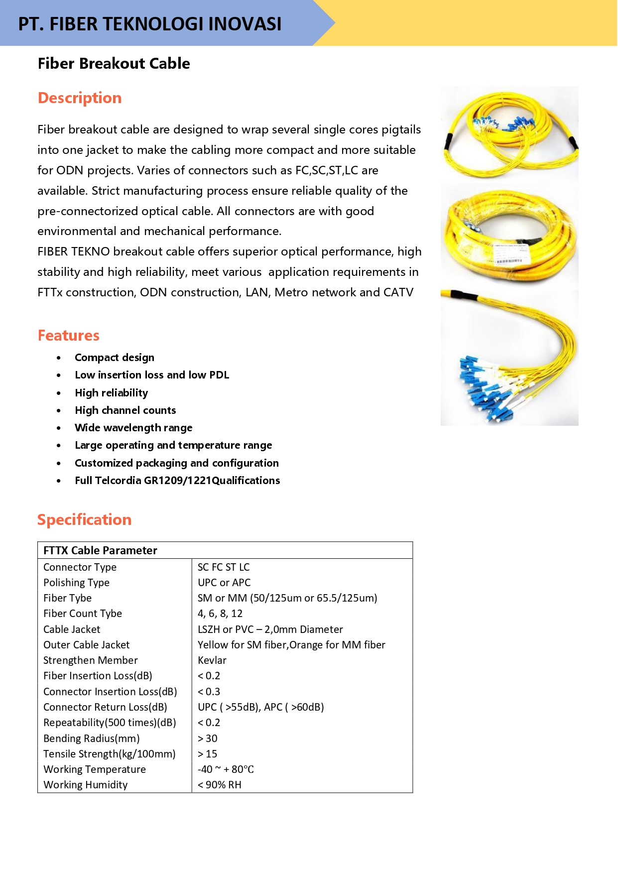 FIBER TEKNO breakout cable offers superior optical performance, high stability and high reliability, meet various application requirements in FTTx construction, ODN construction, LAN, Metro network and CATV