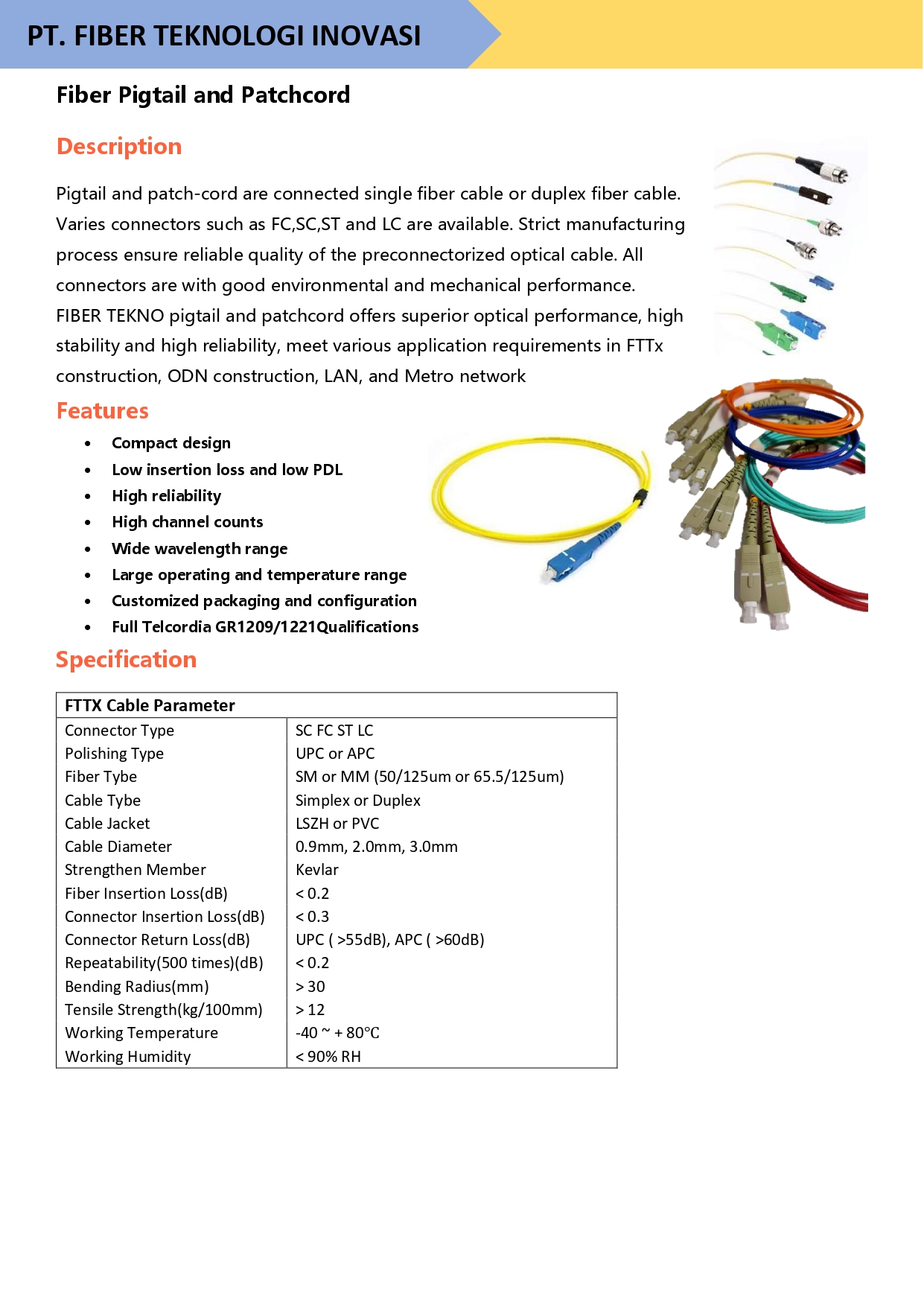 Pigtail and patch-cord are connected single fiber cable or duplex fiber cable. Varies connectors such as FC,SC,ST and LC are available. Strict manufacturing process ensure reliable quality of the preconnectorized optical cable. All connectors are with good environmental and mechanical performance.