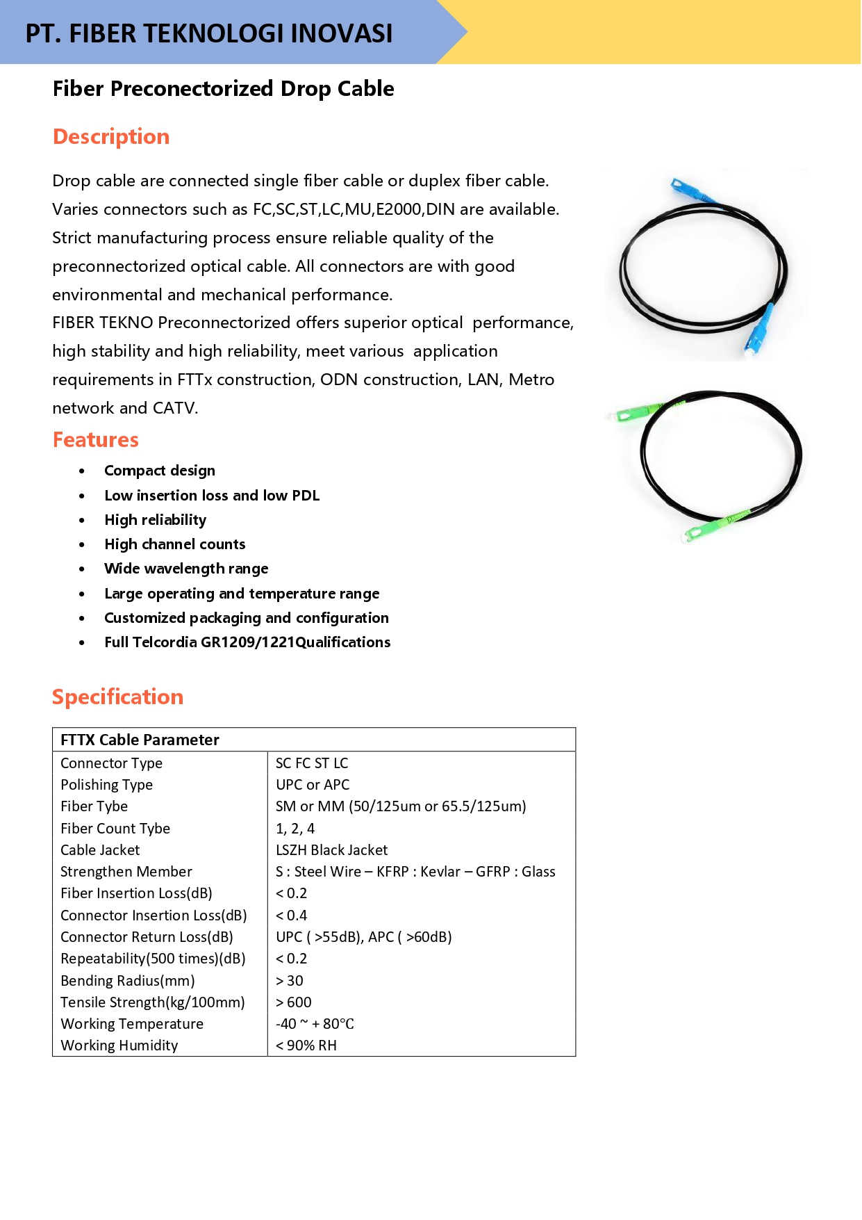 Drop cable are connected single fiber cable or duplex fiber cable. Varies connectors such as FC,SC,ST,LC,MU,E2000,DIN are available. Strict manufacturing process ensure reliable quality of the preconnectorized optical cable. All connectors are with good environmental and mechanical performance.