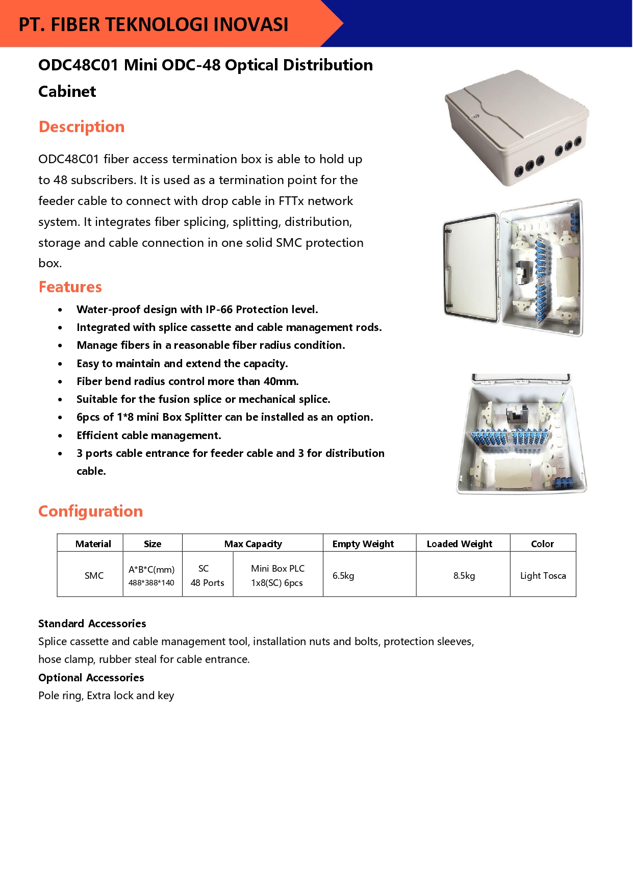 ODC48C01 fiber access termination box is able to hold up to 48 subscribers. It is used as a termination point for the feeder cable to connect with drop cable in FTTx network system.