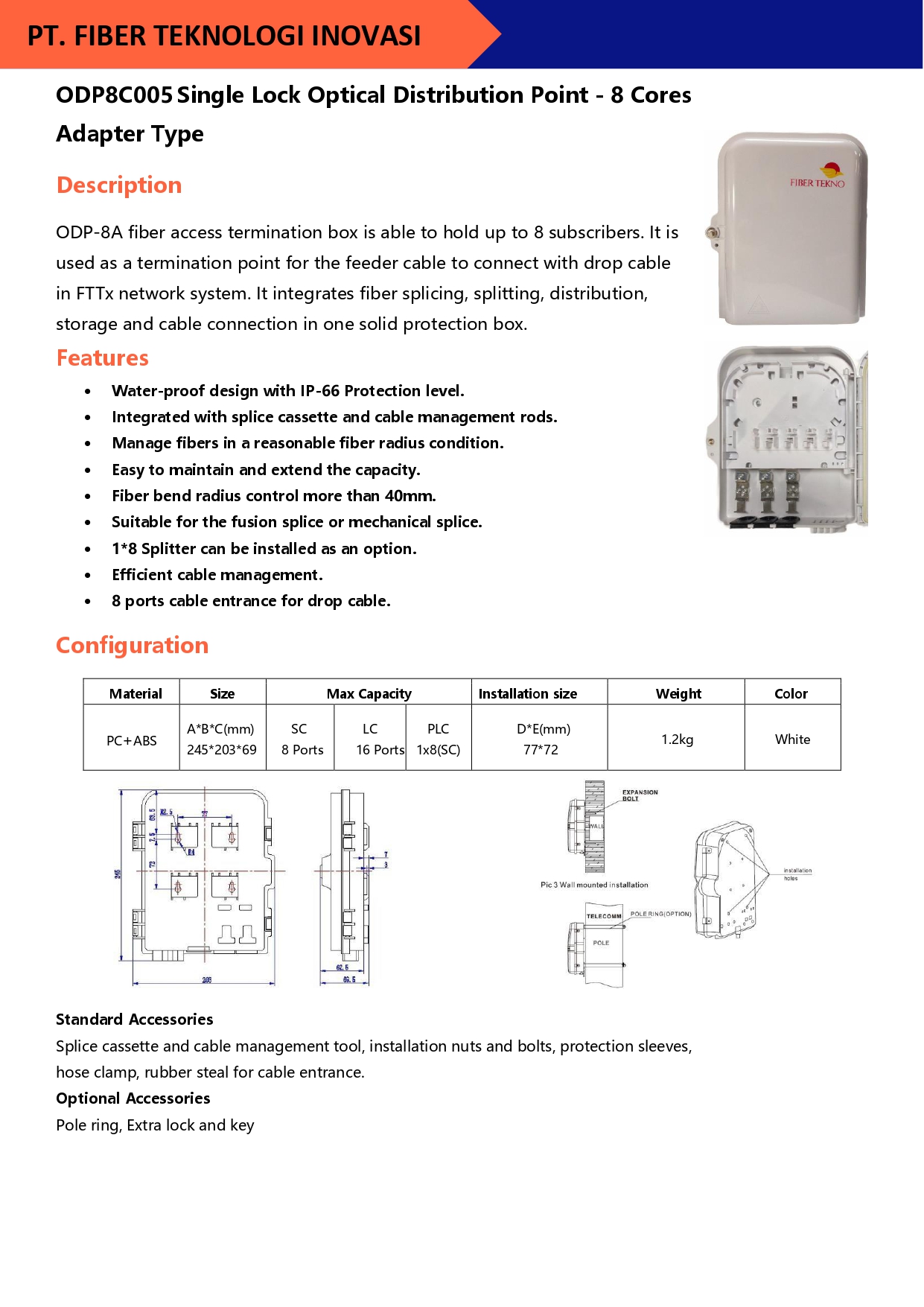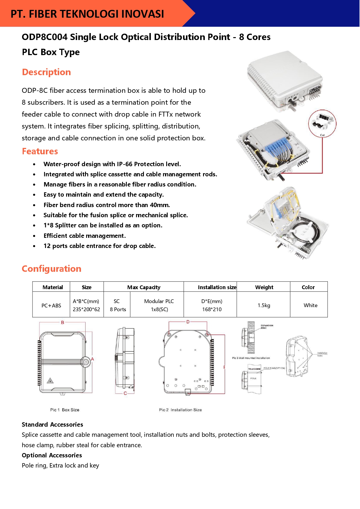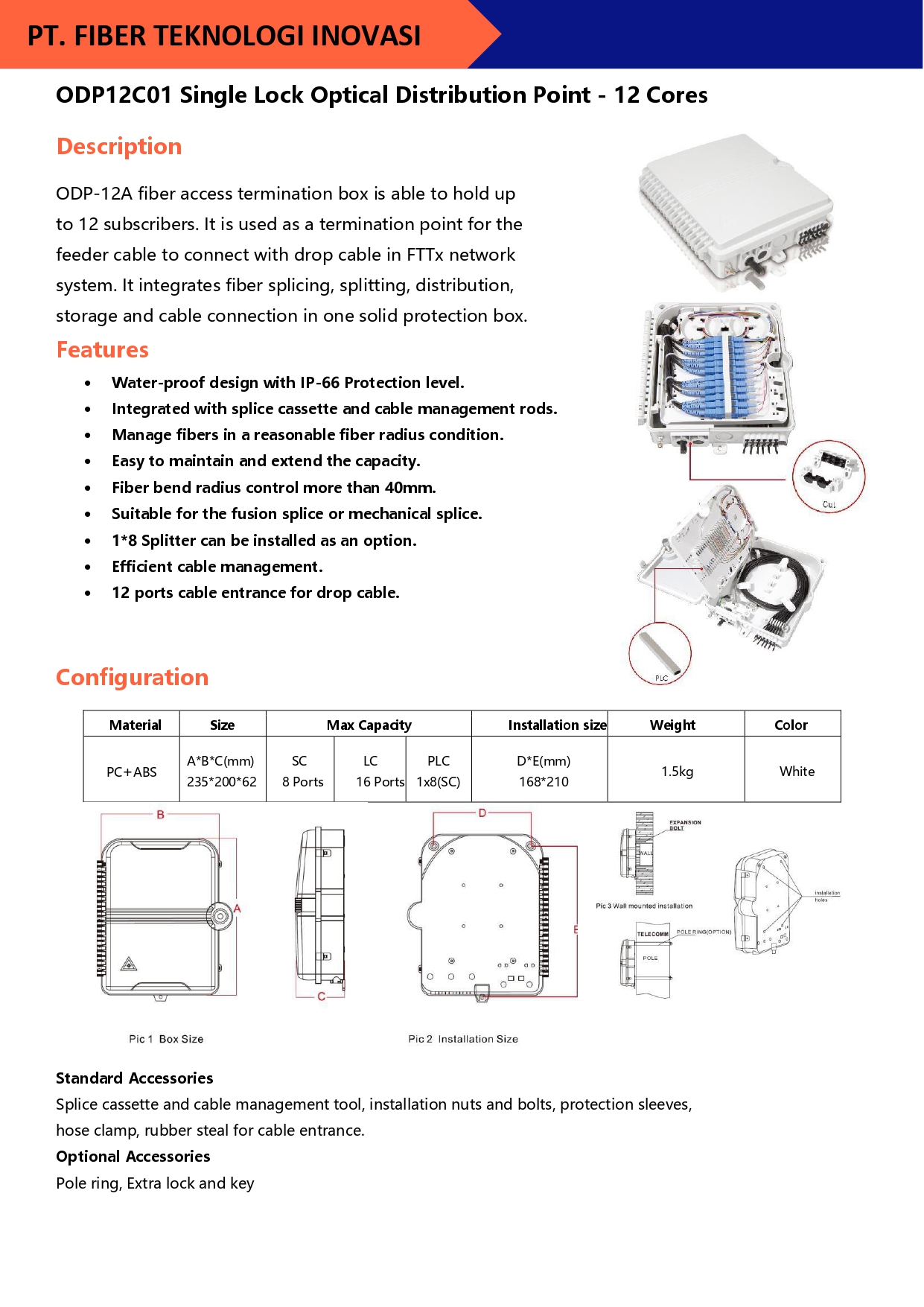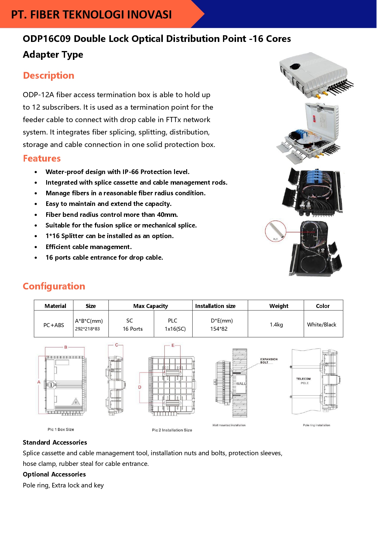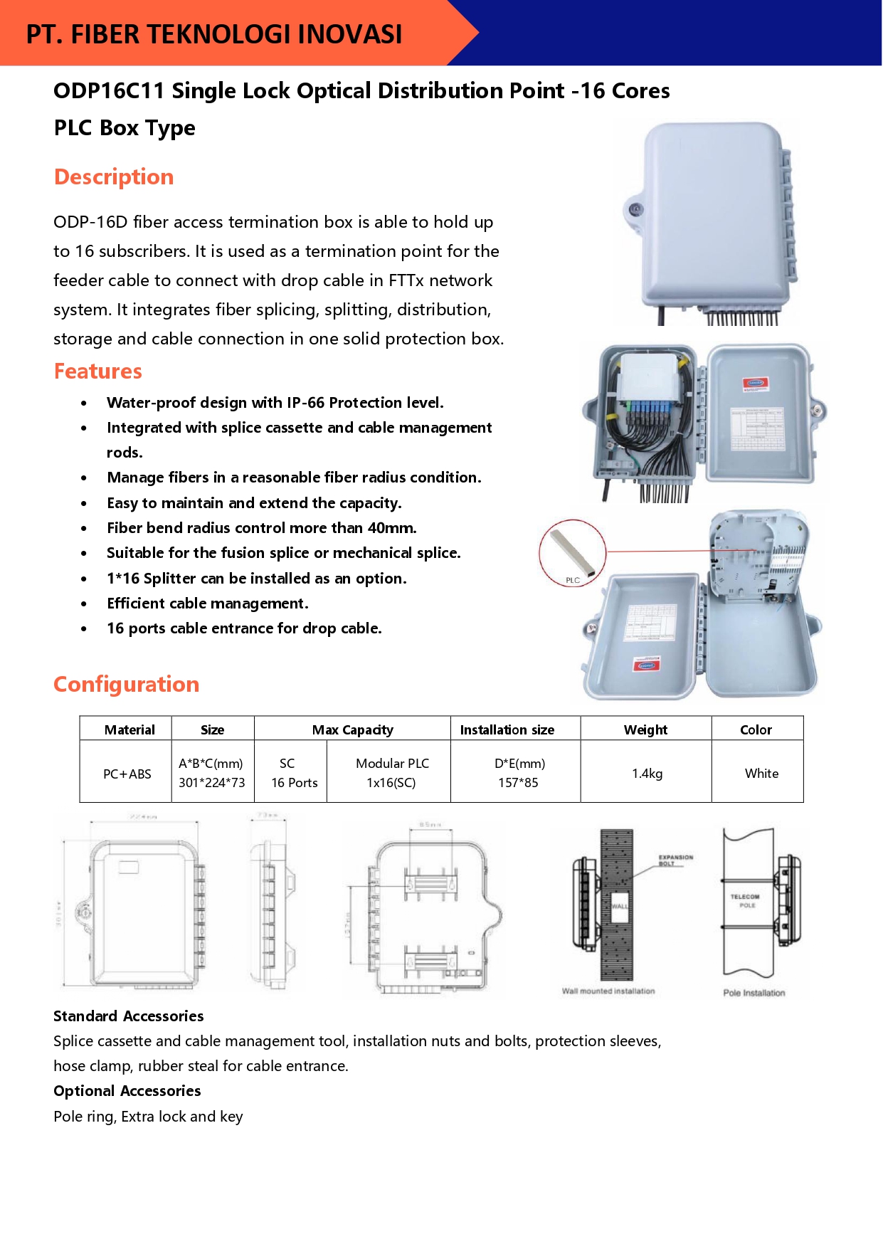 ODP-16C fiber access termination box is able to hold up to 16 subscribers. It is used as a termination point for the feeder cable to connect with drop cable in FTTx network system.