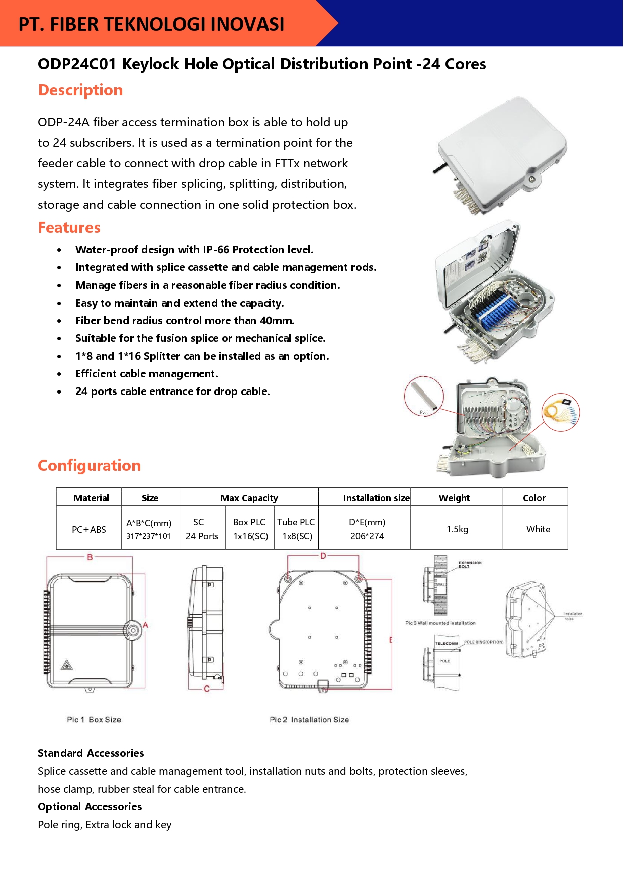 ODP-24A fiber access termination box is able to hold up to 24 subscribers. It is used as a termination point for the feeder cable to connect with drop cable in FTTx network system.