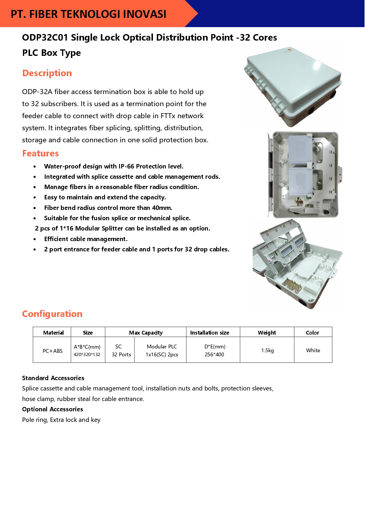 ODP-32A fiber access termination box is able to hold up to 32 subscribers. It is used as a termination point for the feeder cable to connect with drop cable in FTTx network system.