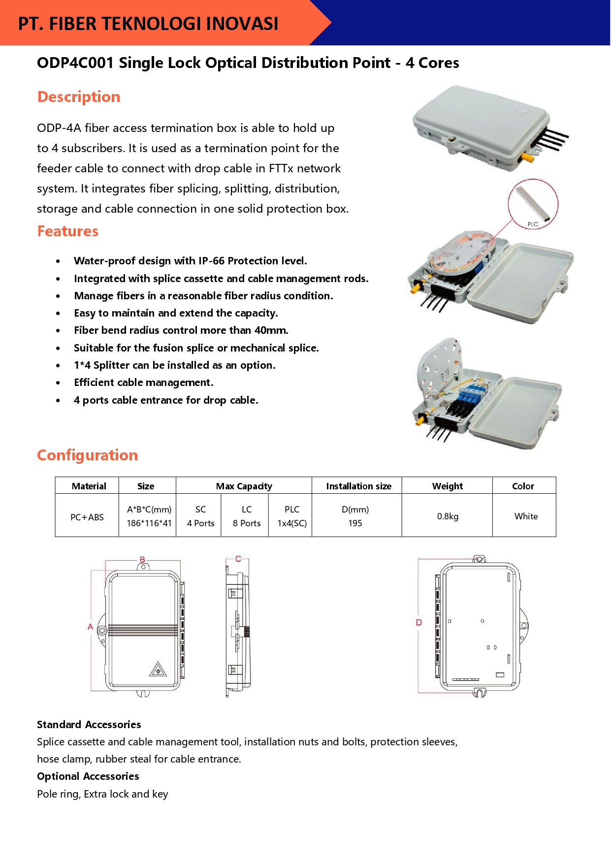 ODP-4A fiber access termination box is able to hold up to 4 subscribers. It is used as a termination point for the feeder cable to connect with drop cable in FTTx network system. It integrates fiber splicing, splitting, distribution, storage and cable connection in one solid protection box.