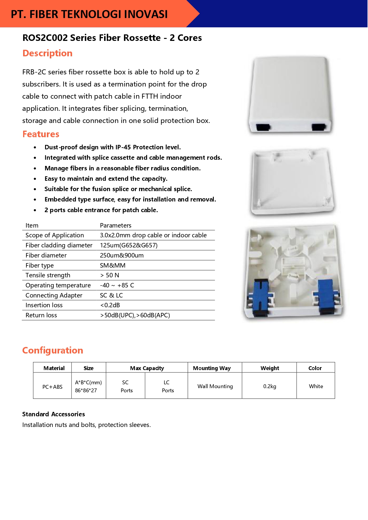 FRB-2C series fiber rossette box is able to hold up to 2 subscribers. It is used as a termination point for the drop cable to connect with patch cable in FTTH indoor application.