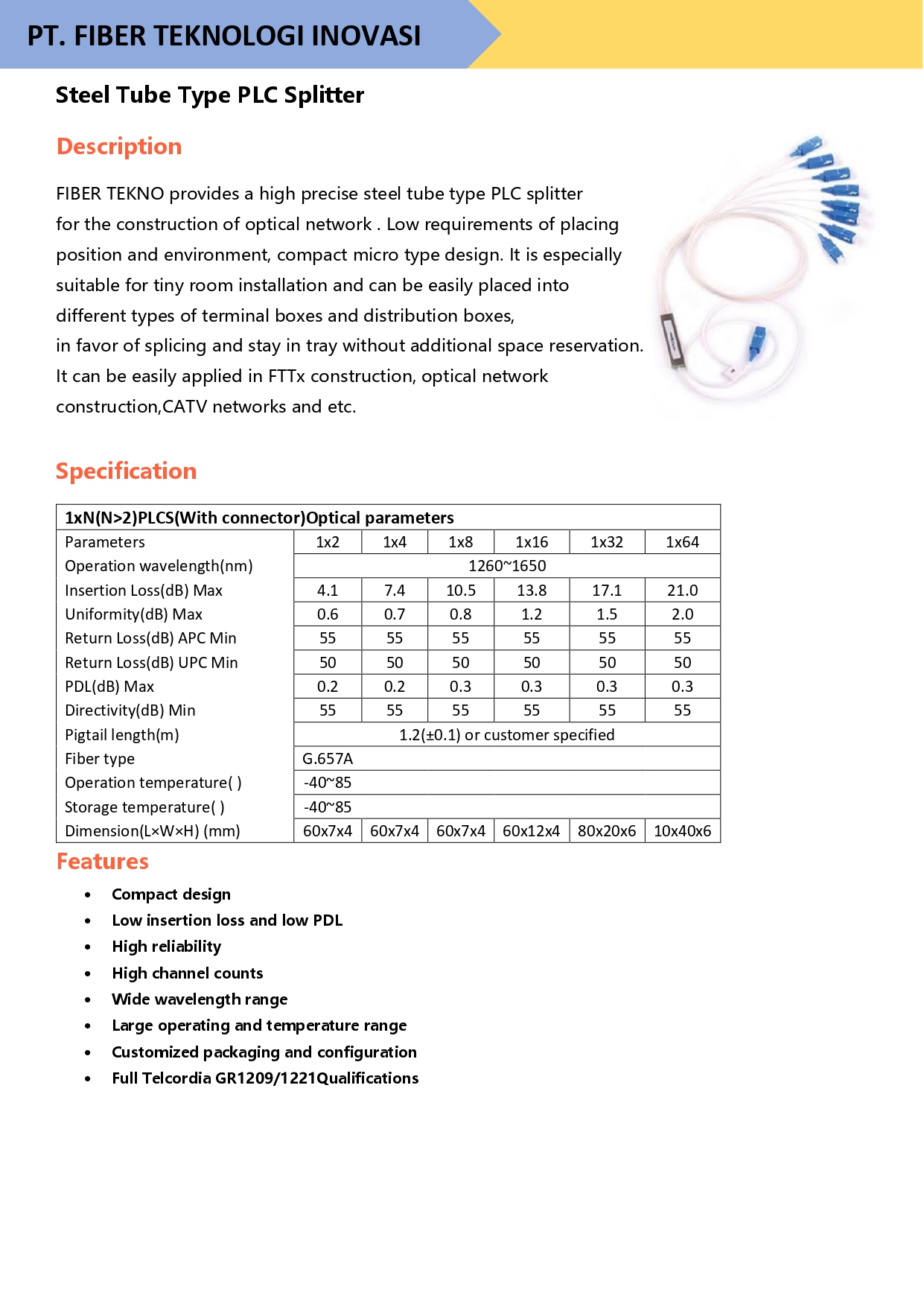 FIBER TEKNO provides a high precise steel tube type PLC splitter